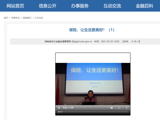为了贯彻落实《湖南省深入开展保险公众宣传三年行动方案》(湘金监发〔2020〕56号)文件精神,持续提高全省公众保险意识,深入推进保险知识进机关。3月3日湖南省地方金融监管局对由我院金年会app手机版在线登录营销教研室教师谢汀芬主讲的《保险,让生活更美好!》讲座进行全程录制,形成系列讲座视频上传至金融局局机关网站,并组织全省各市州金融办保险工作负责人进行学习。